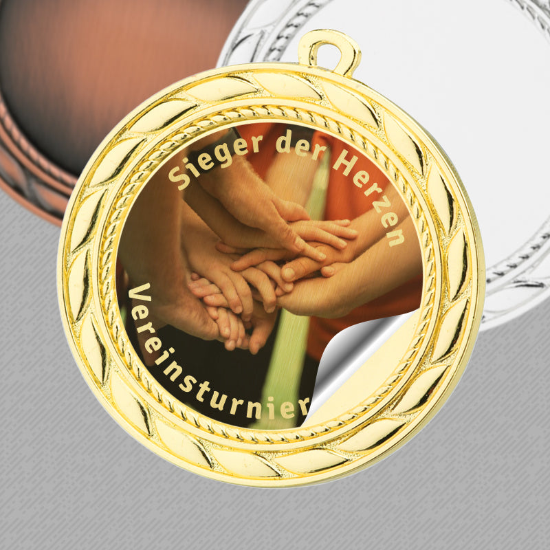 Nachdem du dich für ein Modell unsrer Medaillen entschieden haben, wirst du automatisch zu unserem Konfigurator weitergeleitet, in dem du die gewählte Medaille ganz nach deinen persönlichen Vorstellungen und Wünschen gestalten kannst. Während des Konfigurationsprozesses werden dir sämtliche zur Verfügung stehenden Bänder zur Auswahl angeboten. Du bestimmst die Gestaltung von Vorder- und Rückseite, geben die Beschriftungsqualität vor Aufkleber oder Gravur und können sogar ein eigenes Bild oder Logo hochladen. Gerne kannst du auch eines unserer Grafikvorschläge aussuchen, die wir für die unterschiedlichsten Themenbereiche zur Verfügung stellen.